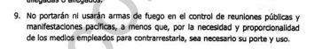 Sin embargo, a pesar de lo que establece la Carta Magna, el artículo 15 de esta resolución establece que durante el desarrollo de las manifestaciones los militares no podrán usar armas de fuego “a menos que por necesidad y proporcionalidad de los medios empleados para contrarrestarla, sea necesario su porte y uso”.