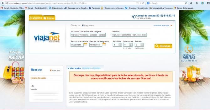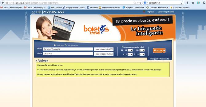 Pero comprar el pasaje con tiempo no parece solucionar el problema. Si ingresa en el portal de Latam Airlines y busca un pasaje Caracas/Lima para el 16 de septiembre de 2014 con regreso el día 23 de ese mes, el portal le indicará que “No existe disponibilidad de vuelos para este destino en las fechas indicadas”. El mismo mensaje de falta disponibilidad aparece cuando se ingresa la ruta Caracas-Quito para el 19 de agosto de 2014.