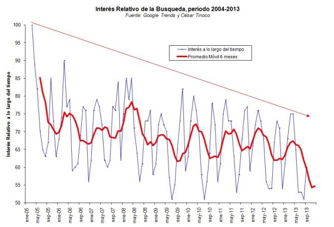 Ahora bien, desde la óptica de cifras más duras, la perspectiva anterior no luce tan buena. A nivel global, el tema de la RSE se percibe un poco saturado. En efecto, cuando uno coloca en la herramienta "Google Trends", las especificaciones "Corporate Social Responsibility" y búsqueda en "todo el mundo" desde el intervalo de tiempo 2004 al presente –el máximo permitido por la herramienta- obtiene lo que se denomina "Interés relativo a lo largo del tiempo". Dicha métrica representa el interés de la búsqueda del tema mencionado en relación al punto más alto del período seleccionado. Representa por tanto, valores de búsqueda relativos. La curva de interés relativo, así directamente suministrada por Google Trends o bien procesada en términos de promedios móviles, evidencia una clara tendencia decreciente con el tiempo y significa que la temática "Corporate Social Responsibility" se busca cada vez menos con relación a su valor más alto verificado en Marzo/2005.