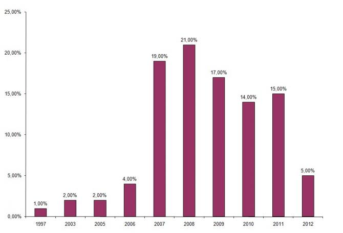 También y de manera consistente con lo anterior, cuando uno revisa el catalogo de trabajos de grado de una universidad cuyo nombre no va al caso, utilizando la palabra clave "Responsabilidad Social", encuentra que aparecen 114 trabajos de grado. Pues bien, el 19% se hicieron en 2007, el 21% en 2008, el 17% en 2009, el 14% en 2010, el 15% en 2011 y el 5% en 2012. En otras palabras, el porcentaje de trabajos (frecuencia) muestra una tendencia decreciente con el tiempo a partir de 2008 cuando alcanzó su máximo.