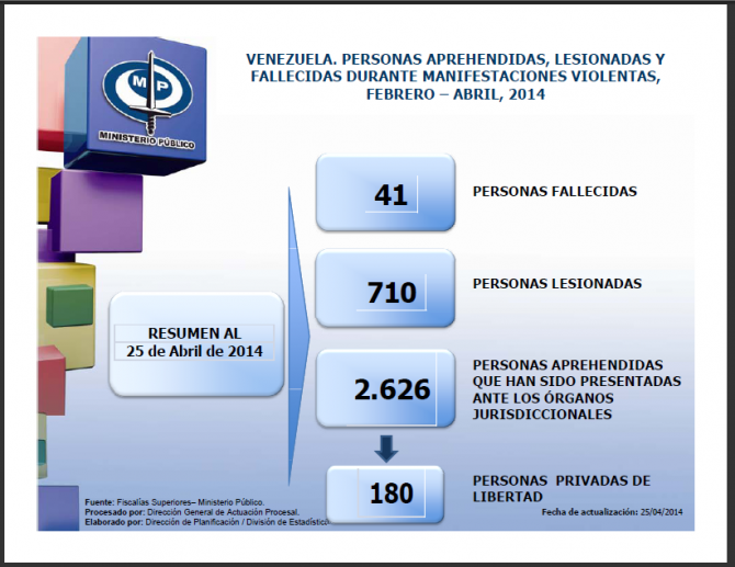 Las protestas ocurridas en Venezuela desde el pasado mes de febrero han dejado un saldo total de 41 personas fallecidas, 710 lesionados y 2.626 personas aprehendidas, según el último reporte emitido por el Ministerio Público.