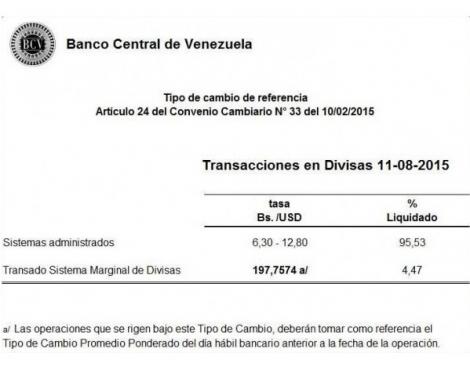 El Banco Central de Venezuela igualmente publicó en su portal que el porcentaje transado hoy por este nuevo esquema cambiario representa el 4,47% de las divisas, mientras que el otro 95,53% sigue liquidándose en los otros dos mercados, el de Bs 6,30 y el de Bs 12,80.