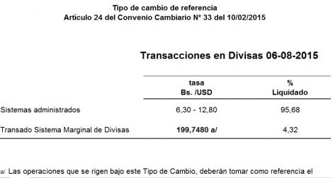 El Banco Central de Venezuela igualmente publicó en su portal que el porcentaje transado hoy por este nuevo esquema cambiario representa el 4,32% de las divisas, mientras que el otro 95,68% sigue liquidándose en los otros dos mercados, el de Bs 6,30 y el de Bs 12,80.