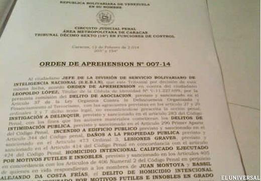 La presunta orden de captura que fue publicada en horas de la madrugada del día de hoy se lee que la jueza 16 de Control de Caracas, Ralenys Tovar Guillén, aceptó la petición que le hizo la Fiscalía para detener al exalcalde de Chacao. En la orden número 007-14 la funcionaria manda capturar a López para ser procesado por los delitos: asociación para delinquir, instigación a delinquir, intimidación pública, incendio a edificio público, daños a la propiedad pública, lesiones graves, homicidio y terrorismo.