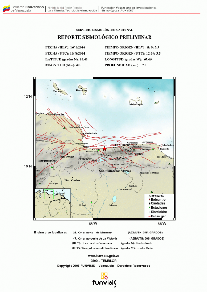 Según la Fundación Venezolana de Investigaciones Sismológicas (Funvisis), el sismo fue a las 08:09 hora local de Venezuela en el estado Aragua.