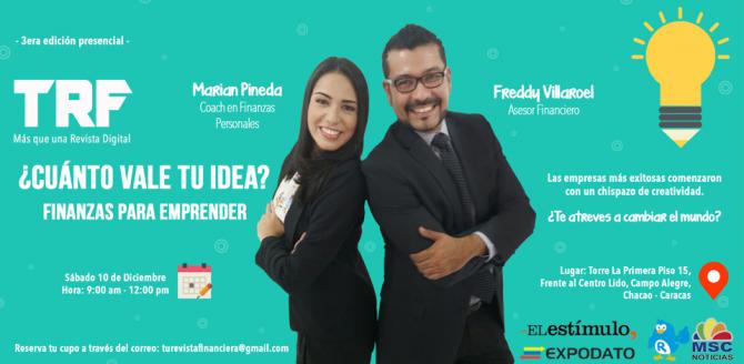 En la actividad ¿Cuánto vale tu idea? Finanzas para emprender, que se realizará el 10 de diciembre, los participantes obtendrán un abanico de opciones, para generar emprendimientos autosustentables aun en entornos cambiantes, los interesados pueden escribir a turevistafinanciera@gmail.com, llamar a los números 0414-2936751 y 0412-2937745 y seguir las redes Instagram y Twitter @trfinanciera, Facebook Tu Revista Financiera