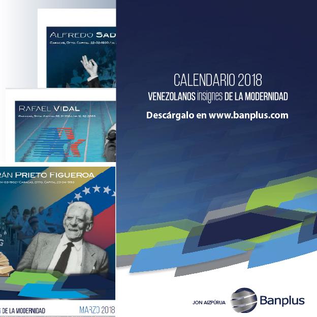 Banplus Banco Universal hace un nuevo aporte a la cultura e identidad del venezolano con el lanzamiento del Calendario 2018 que se suma a las producciones editoriales de años anteriores. En esta ocasión, presenta la reseña biográfica de doce “Venezolanos insignes de la modernidad. La selección contó con la asesoría experta del historiador Jon Aizpúrua, quien también facilitó su talento para la autoría y propuesta de las ilustraciones, acompañando al banco como en anteriores entregas. Se puede obtener el calendario al descargarlo, sin costo, de la página www.banplus.com, sección Somos Banplus / Cultura Corporativa / Ediciones Banplus.