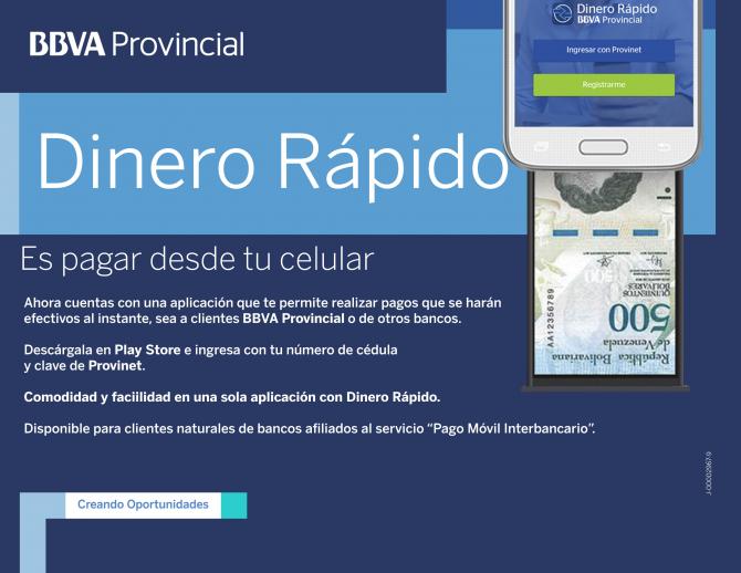 Con la nueva aplicación móvil Dinero Rápido, los clientes de BBVA Provincial podrán realizar pagos desde sus teléfonos celulares a personas naturales o comercios clientes del mismo banco; o a personas naturales de otros bancos que estén afiliados al servicio Pago Móvil Interbancario.