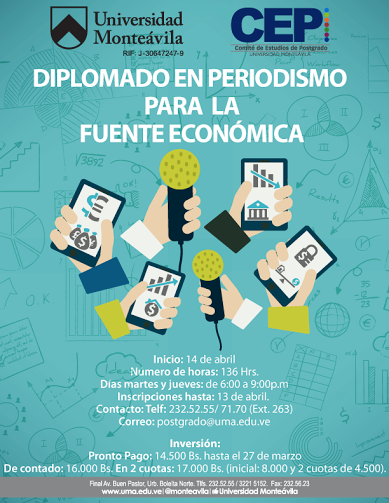 El Comité de Estudios de Posgrado de la Universidad Monteávila invita a los periodistas a participar en el Diplomado en Periodismo para la Fuente Económica, que "brindará conocimientos sobre economía, historia económica, fundamentos jurídicos, herramientas de búsqueda y manejo de la fuente económica en los distintos medios de comunicación", según informó la economista Anabella Abadi.