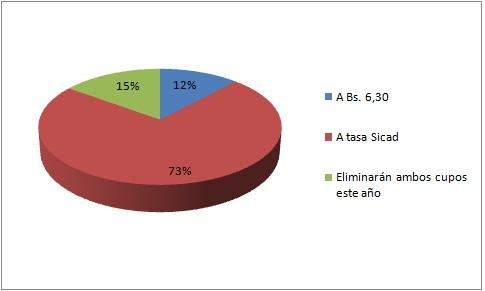 Debido a esta interrogante, la consulta semanal de DINERO se enfocó en pulsar la opinión de nuestros lectores sobre a cuál tasa se empezaría a cotizar ambas asignaciones. El 12% de los consultados opinó que se mantendría a la tasa preferencial de Bs. 6,30; otro 15% proyectó que ambos cupos serían eliminados mientras que la gran mayoría, el 73%, acertó al vaticinar que pasarían a la tasa Sicad.
