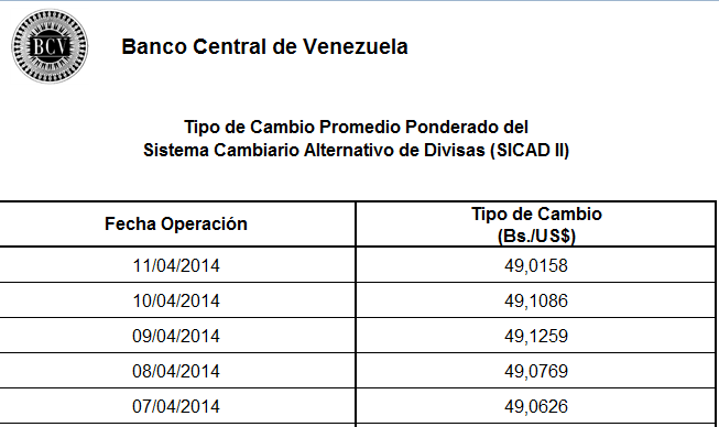 Este viernes, 11 de abril, la tasa de cambio promedio del Sistema Cambiario Alternativo de Divisas (Sicad II) se ubicó en 49,01 bolívares por dólar. Así lo reflejó en Banco Central de Venezuela (BCV) en su sitio web.